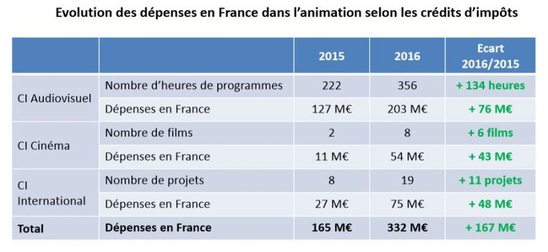 C’est bien connu, les bonnes nouvelles n’arrivent jamais seules : le CNC observe aussi une relocalisation de l’activité et des dépenses – ceci expliquant peut-être cela. Ce fait résulte de la réforme du soutien à l’animation et des effets du crédit d’impôt, selon l’institution. Par rapport à 2015, la mesure prise sous le gouvernement Ayrault a eu pour conséquence un doublement des dépenses consacrées au secteur en France, soit 167 millions d’euros supplémentaires. En un an, les professionnels de l’animation ont, quant à eux, produit 134 heures de plus et 6 films supplémentaires. Quinze nouvelles séries ont également été diffusées sur les chaînes nationales l’année dernière.