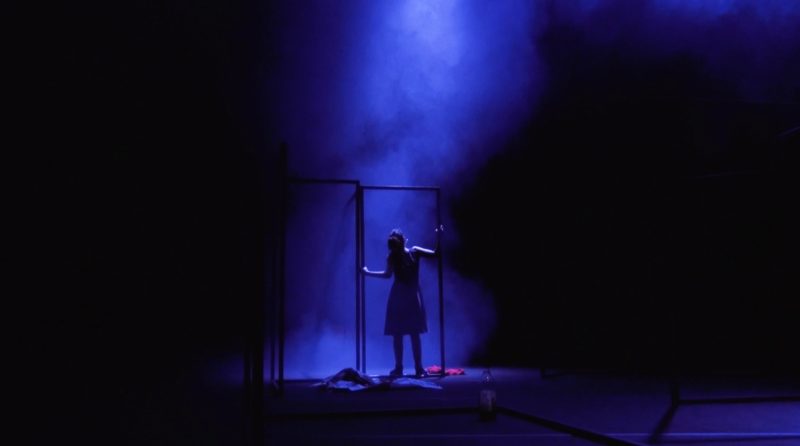 La scénographie est pensée autour d’un vaste espace nu, à la pauvreté volontaire, à la centralité assumée : côté jardin, deux microphones sur pieds ; côté cour, un simple banc. Au fond, une structure métallique signifie les espaces, les frontières illusoires (qui s’effondrent au sol ou, instables, changent de position), piètres divisions pour qui n’a pas d’abri, de sécurité, qui ne connaît que la lame métallique d’un quotidien tranchant. Les comédiens jouent avec ces structures de métal, ils tournent autour, les déplacent, s’y pendent, comme un contrepied imagé à l’expression bien connue de « structures d’accueil », qui n’offrent en réalité guère d’hospitalité qu’une série de matelas miteux indifféremment alignés.