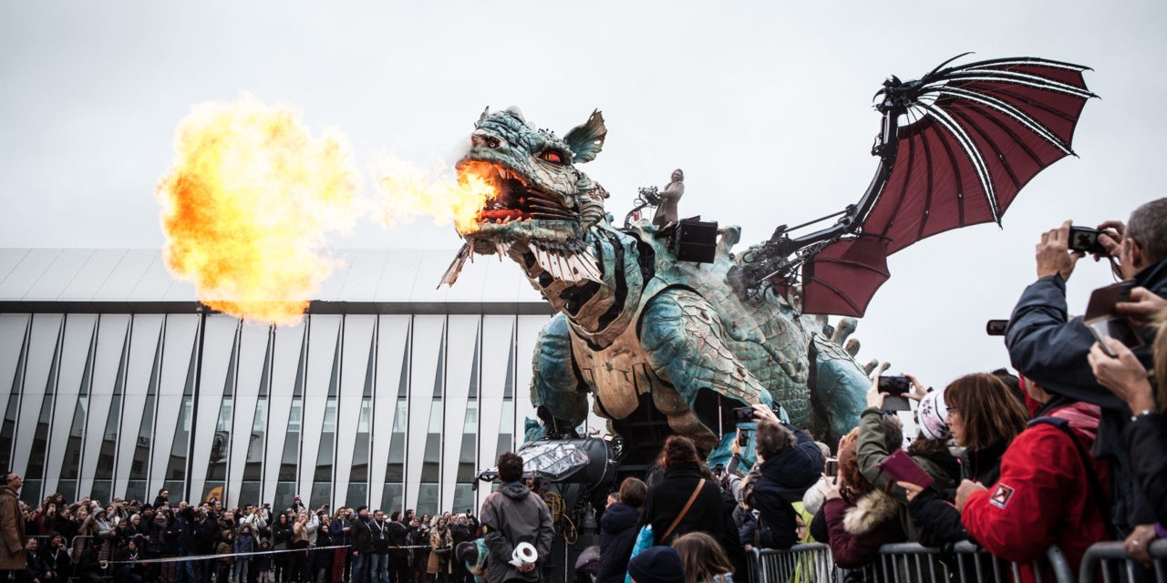 Un gigantesque dragon a investi les rues de Calais tout début novembre. Une prouesse artistique et technique, en même temps qu’un récit qui rejoint les habitants de la ville. Profession Spectacle y était.