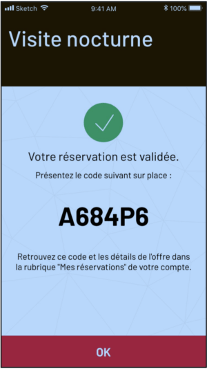Le ticket est un code alphanumérique de six caractères (photo), qui s’affiche sur l’application de l’utilisateur une fois la réservation effectuée. Pour le moment, ce code vous est envoyé par courriel avec le pseudonyme et l’adresse mail de l’utilisateur. C’est ensuite à vous d’éditer ou non un billet avant la venue de ce spectateur ou visiteur.