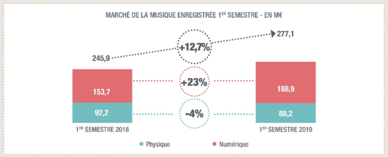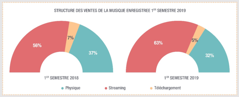 En hausse de 23 %, le digital réalise désormais plus des deux-tiers des revenus, contre 60 % seulement au premier semestre 2018. En progression de 28,3 % par rapport au premier semestre 2018, le chiffre d’affaires du streaming porte la dynamique de ce marché, et représente 175,3 millions d’euros, soit 93 % des revenus numériques (89 % au premier semestre 2018).