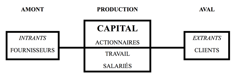 Le cœur de l’entreprise est la fonction de production, combinaison du facteur capital et du facteur travail, optimisée pour obtenir la plus grande différence possible entre ce qui est acheté en amont et ce qui vendu en aval ; on aura reconnu dans cette différence la valeur ajoutée, qui sera partagée entre la rémunération du travail (masse salariale) et celle du capital (excédent brut d’exploitation).