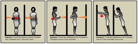 Le violoncelliste débutant semble particulièrement exposé car il va devoir non seulement gérer de nouvelles contraintes liées à l’apprentissage de cet instrument (poids de l’archet, mouvements répétés,…), mais, en plus il est dans une stratégie motrice particulièrement sollicitante pour l’épaule. D’autre part, l’instrumentiste non expert présente une variation dans les stratégies motrices développées au niveau du bras droit ce qui augmente l’effort musculaire à réaliser pour obtenir un son adéquat et une fatigue précoce. Il semble donc indispensable de mettre en place la prévention des pathologies de l’épaule dès le début de l’apprentissage du violoncelle. Le travail de cet instrument induit naturellement une faiblesse des stabilisateurs de l’omoplate et un développement de la force des muscles permettant de maintenir le bras sur le côté tout en déplaçant l’archet. Ce déséquilibre musculaire doit donc être compensé par des exercices spécifiques de renforcement au niveau des muscles rotateurs internes (exercice 1) et des stabilisateurs de l’omoplate (exercices 2 et 3), ainsi que des exercices d’étirement de l’épaule. Parallèlement, la posture du dos du violoncelliste doit être observée et corrigée dès le début de l’apprentissage.