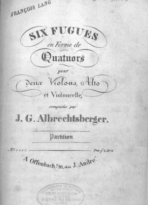1 Fondation Royaumont Bibliothèque musicale François Lang (coll. F. Lang): J. G. Albrechtsberger, Six fugues en forme de quatuor pour deux violons, alto et violoncelle, Offenbach s/Main, chez J. André, [c.1835], cot. Ed. 5257, partition 36 p. ; 27 cm, p. titre : signature de V. d’Indy au crayon, tampon « François Lang » à l’encre bleue.