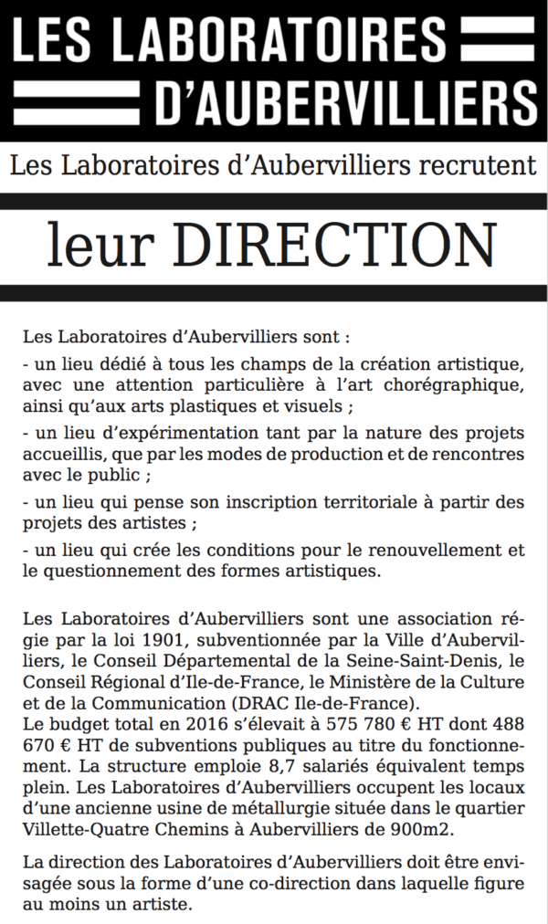 Les Laboratoires d’Aubervilliers recherchent un directeur (f/h).