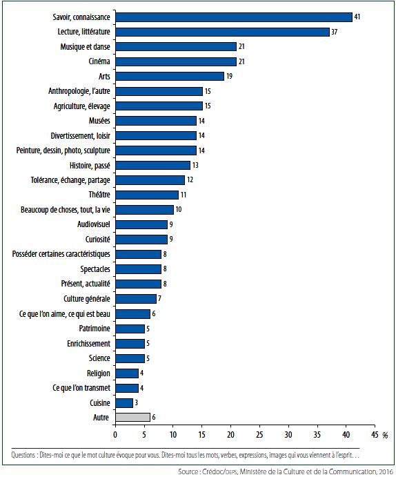 Quels sont les premiers mots qui vous viennent à l’esprit quand vous devez évoquer la culture ? En fonction de la variété des réponses données, 28 registres sont ressortis des entretiens. À 41 %, les personnes interrogées estiment que le terme culture est associé à la connaissance, au savoir accumulé et transmis, ou comme un processus d’acquisition de connaissances. Pour les auteurs, c’est une conception héritée de « la vision encyclopédique du siècle des Lumières ». On retrouve ensuite des termes relatifs à la lecture et la littérature (37 %), puis ceux liés à l’expression artistique comme la musique ou bien la danse (21 %), le cinéma (21 %) et les arts de manière plus globale (19%).