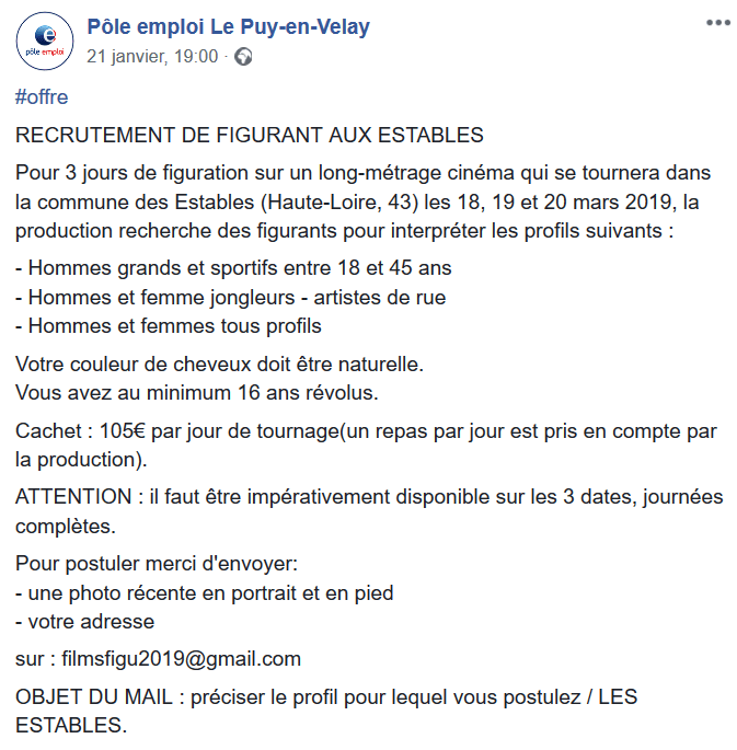 Nous venons de mettre à jour l’article. L’offre de Pôle Emploi était bien réelle, mais elle n’est plus d’actualité, tous les figurants ont été trouvés.