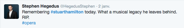 Le décès de Georges Prêtre a fait, à juste titre, la Une des journaux français. Un autre ténor contemporain de la musique vient également de mourir : il est Canadien, pionnier de l’opéra dans son pays : Stuart Hamilton, premier directeur de la Canadian Opera Company, est décédé le 1er janvier, à l’âge de 87 ans, d’un cancer de la prostate. Il fut à l’origine de nombreuses carrières prestigieuses. Un « passeur indispensable » en son pays, selon les pouvoirs politiques canadiens.