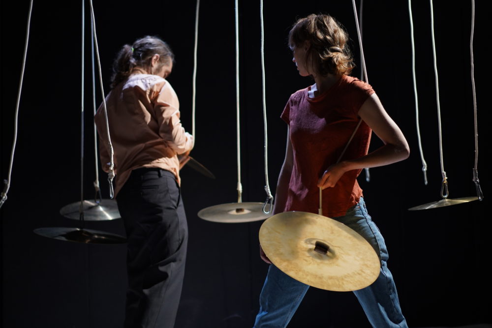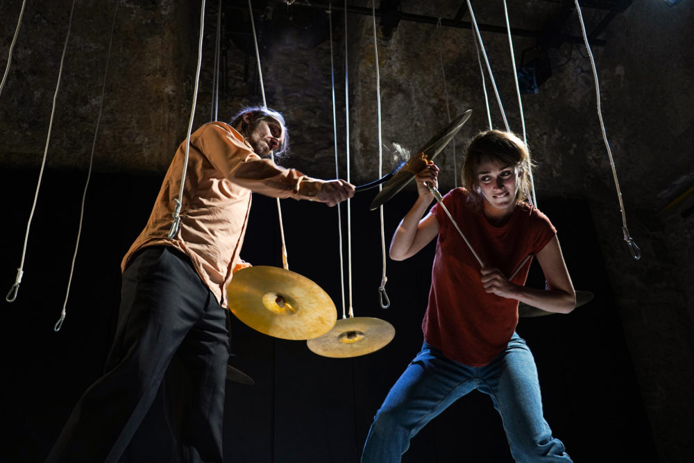 La comédienne Claire Cahen est seule sur la scène quadrillée de lignes verticales : une vingtaine de cordelettes élastiques lestées par des poids. Ce décor modulable pouvant faire office de rideau, de porte ou encore de chewing-gum représente la passion de la petite fille ascolaire pour les élastiques qu’elle transporte par poignées dans ses poches. La comédienne les déplace avec dextérité, s’y love ou les entortille. C’est d’une ingéniosité folle. Les trouvailles sont nombreuses : le son d’une craie au tableau est produit par un micro frotté sur le jean, des cymbales accrochées aux cordelettes créent le cataclysme final.