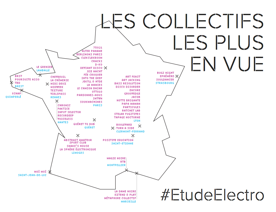 Phénomène récent, le collectif devient une forme prisée des artistes, afin de mutualiser les moyens de production et de promotion. Les collectifs permettent également e créer des soirées et des événements réguliers, en fédérant des publics plus larges. L’étude dénombre ainsi plus d’une soixantaine de collectifs importants en France, dont près de 40 sont établis à Paris, Lyon, Rennes et Nantes.