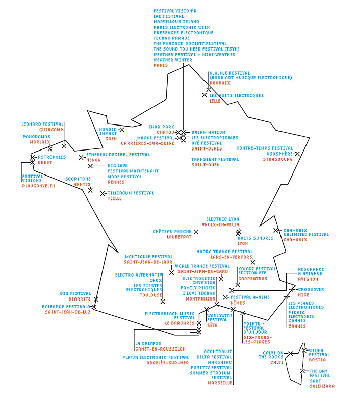 Le live représente 82 % du poids économique pour les musiques électro. On compte en France 60 festivals dédiés spécifiquement aux musiques électroniques, dont 60 % se concentrent dans seulement trois régions : Île-de-France, PACA et Occitanie. Malgré les nombreuses luttes entre les institutions et les rave, celles-ci ont su évolué vers des festivals reconnus et de plus en plus nombreux.