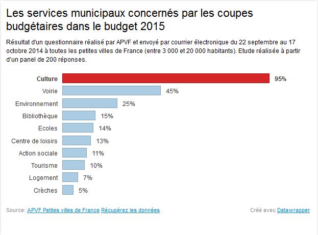 Si l’on se penche un peu sur les priorités de nos élus de province, on se rend compte que le grand perdant des budgets en 2015 (celui de 2016 étant en cours d’élaboration) est bien la culture. C’est ce que révèle une étude sur les politiques municipales, réalisée par l’association des petites villes de France APVF. Sur 200 petites villes interrogées, 95% répondent que c’est dans ces fonds qu’elles comptent faire des économies.