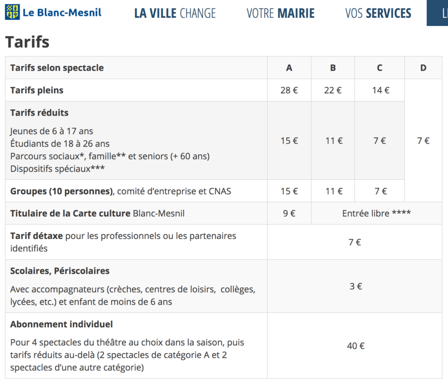 Nous voyons ainsi la municipalité du Blanc-Mesnil investir 1,4 million, agrandir la salle et, soudain, la confier à un tourneur privé dont la seule promesse est que le prix des places ne dépassera pas… 45 euros pour les habitants ! 45 euros, contre 28 euros précédemment (cf. tableau à la fin d’article), dans une ville où beaucoup d’habitants vivent dans une certaine pauvreté. Pour rappel, au Blanc-Mesnil, un foyer fiscal sur deux n’est pas imposable, le revenu net annuel par ménage étant inférieur à la moyenne départementale.