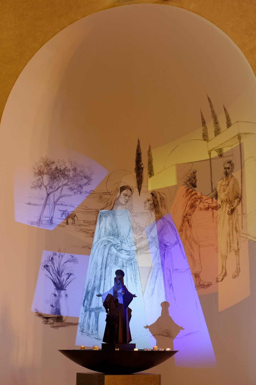 Le mouvement des couleurs suit la vitesse des nuages, affleurant doucement, comme une caresse, sur les dessins au fusain de Jean-Louis Sauvat. Comme une toile de Mark Rothko qui serait en perpétuel mouvement. « Le numérique n’apporte pas tout, de manière artificielle, mais entre en dialogue avec la peinture, la sculpture et l’ensemble de l’espace liturgique », reconnaît le père Bancon. Il y a quelque chose d’éphémère, tant dans le dessin que dans les lumières, tel un voyage permanent qui guiderait le visiteur – paroissien croyant ou touriste athée – vers sa propre intériorité. « Ces espaces sont vivants, s’enthousiasme Nathan Crouzet. Les fresques pourront évoluer dans le temps, avec des possibilités de colorisation infinies, en fonction des désirs et des goûts artistiques de chaque époque. »