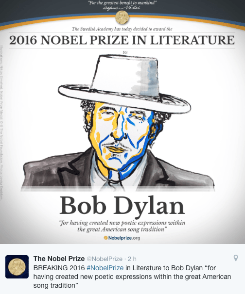 Le prix Nobel de littérature a été attribué au chanteur américain Bob Dylan, 75 ans, a annoncé aujourd’hui l’Académie suédoise. Il a été récompensé « pour avoir créé dans le cadre de la grande tradition de la musique américaine de nouveaux modes d’expression poétique », a annoncé la secrétaire générale de l’Académie, Sara Danius. L’Américain, premier musicien a être récompensé par l’Académie depuis la création du prix en 1901, succède à la Bélarusse Svetlana Alexievitch.