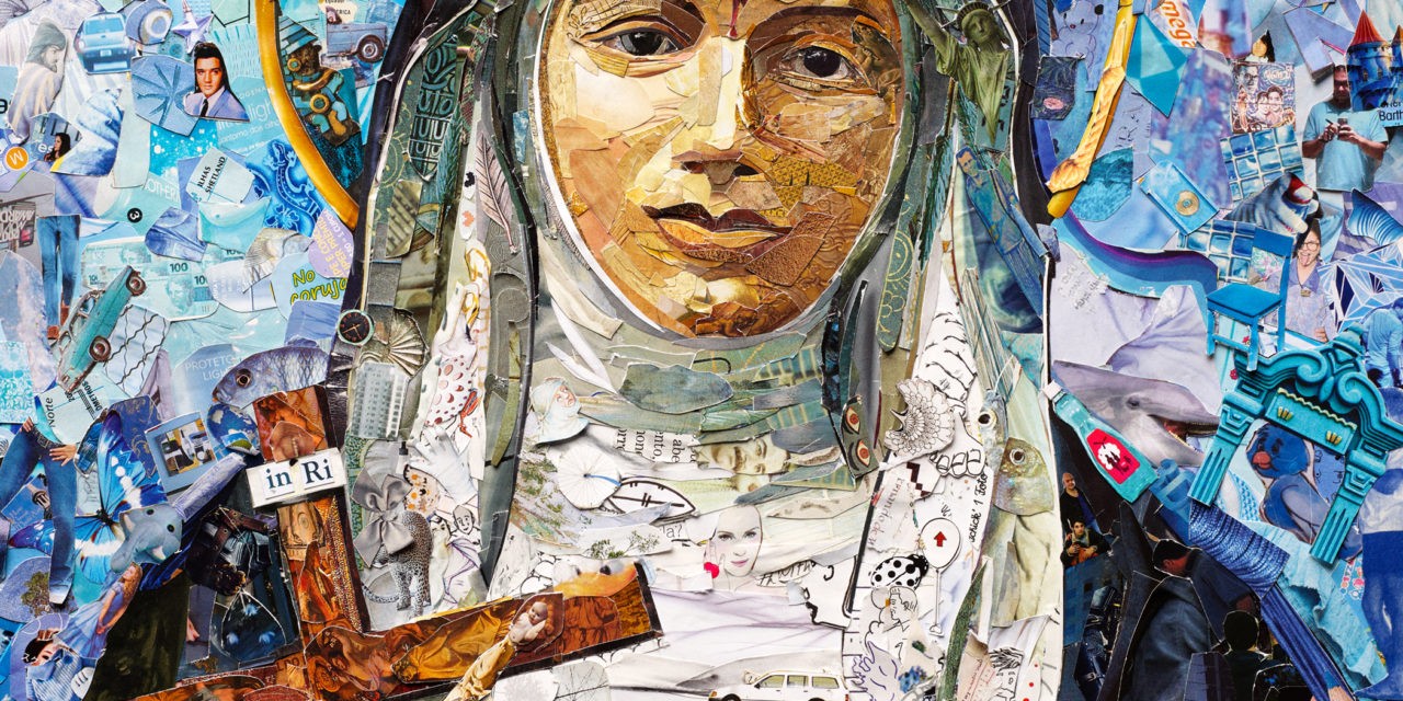 Pour cette nouvelle exposition, il évoque quinze saints catholiques peints par de grand artistes de la Renaissance. En les plagiant, il questionne non seulement la notion de copie mais aussi l’omniprésence du sacré dans l’art. Nous découvrons ainsi sainte Rita, patronne des causes désespérées, représentée avec des roses dans les mains. Au centre de la fleur, nous voyons le visage de Frida Kahlo et, dans l’azur autour de la sainte, la robe d’éther de Marie-Antoinette, un perroquet bleu, un dauphin bleu, un jean, un cosmonaute, la Statue de la Liberté et Elvis. « InRi » figure sur la croix du Christ ? C’est en vérité un découpage du journal O Globo pour « In Rio » ! Comme dans une mosaïque ou un vitrail, la partie dialogue avec le tout.