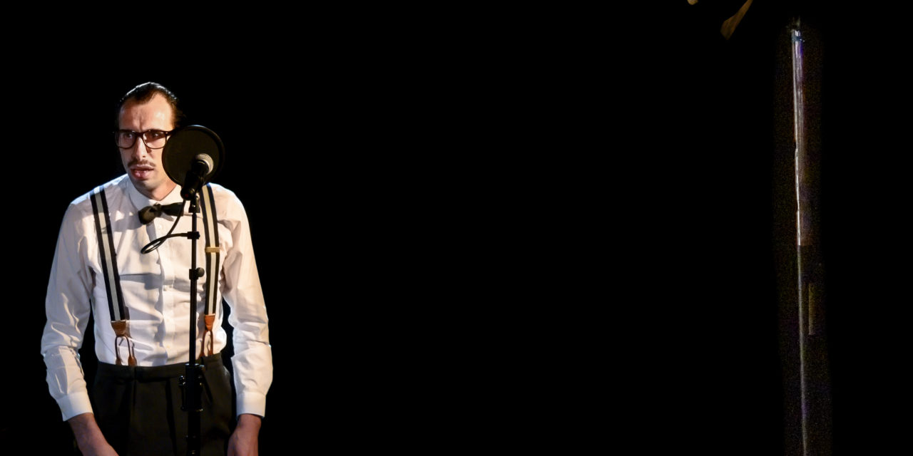 L’entrée dans la salle rime avec entrée dans un studio d’enregistrement radiophonique. Sous le regard ahuri de Robert, nous nous installons ; nous comprenons d’emblée les raisons de son hébétude et (sou-)rions déjà. En un regard, en un miroir, par un début de geste, Robert – interprété par le jeune comédien Augustin Ledieu – provoque l’hilarité. Les premières minutes sont dans cet esprit : l’hébétude, l’incompréhension, la lenteur, avant de monter intelligemment en puissance jusqu’à la folie… et l’échec, l’inexorable chute, qui se répétera tout au long de la pièce (ou presque).
