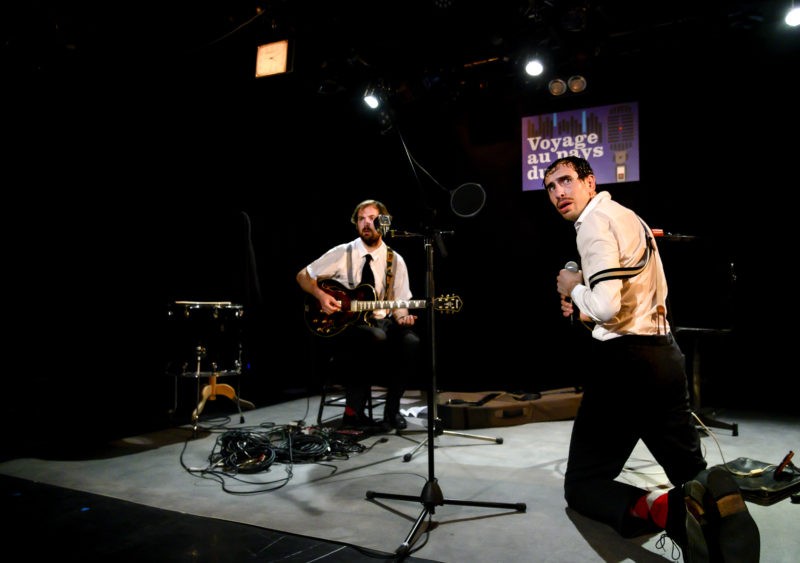 Nous le comprenons : le pari est résolument clownesque. Il est celui de la metteure en scène Sandrine Righeschi, qui a rencontré le jeune duo musical constitué d’Augustin Ledieu (voix, claviers) et Matthias Lauriot Prevost (guitare, batterie, trompette) alors qu’il donnait des récitals au théâtre la Cible (quartier de Pigalle, à Paris) sur l’histoire du jazz. Elle a donné chair théâtrale et scénique à cette ossature. Le résultat est sympathique, drôle, vivant. Les deux comédiens-musiciens se débattent ainsi pour réussir l’émission de radio, synonyme de non-licenciement, mais vont d’échecs en échecs : fuite d’eau, oubli d’un trombone, électrocution, angoisse, etc. Rien ne leur est épargné ; toujours ils cherchent à se relever, à créer, à avancer…